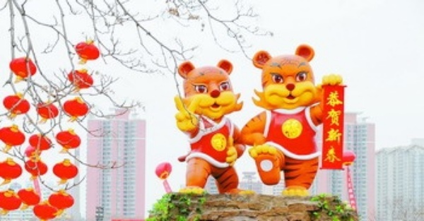 虎年灯会的主题自然离不开虎。从灯会入口处开始,两侧分列着100只造型各异的老虎,最大的灯组“虎虎生威”高达9.5米,一只猛虎昂首摆尾吼声震天,引得游客频频举起相机、手机拍照留念。