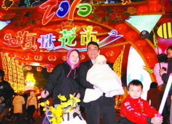 图③ 除夕夜虽然下着小雨,但广州市民逛花街热情不减。据统计,广州迎春花市三天的客流量达到379万人次,成交额2450万元。 本报记者 张 欣摄