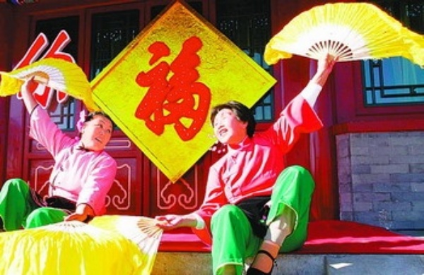 中图:两位群众演员起劲地舞起了扇子,跳得很投入。春节期间,广州市各大公园开展了很多别开生面的群众文艺演出活动。 本报记者 张 欣摄