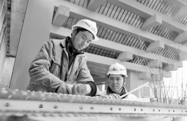 上图 农历正月初一,上海建工集团建设者在世博园中国馆前进行装饰施工。春节期间,众多世博园的建设者依旧坚守在世博园区的工作岗位上。 新华社发