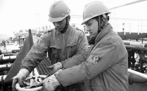 下图 2月14日,中国长航南京油运股份有限公司大庆454轮船员顶着风雪在甲板上进行卸油作业。中国长航南京油运股份有限公司的众多船员放弃春节假期,坚守在各自的岗位上。
