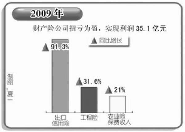 2009年,我国保险业整体发展好于预期,保费收入首次突破1万亿元,达到11137.3亿元,同比增长13.8%。财产险业务继续保持较快增长,保费收入2875.8亿元,同比增长23.1%。其中农业险、出口信用险、工程险等非车险业务分别同比增长21%、91.3%和31.6%,财产险公司扭亏为盈,实现利润35.1亿元。人身险业务保费收入8261.5亿元,全年赔付3125.5亿元。