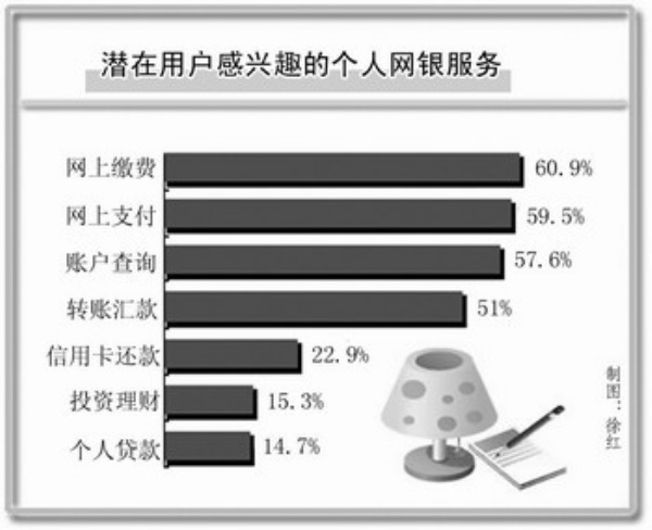企业用户方面,账户查询、转账汇款则是他们使用比例最高的两项企业网银功能。活跃度的提升以及对网银功能的更多尝试表明,对于很多网银用户来说,使用网银正在由对新鲜事物的浅尝辄止转变为日常生活和企业运营的必需,网银普及正向纵深发展。