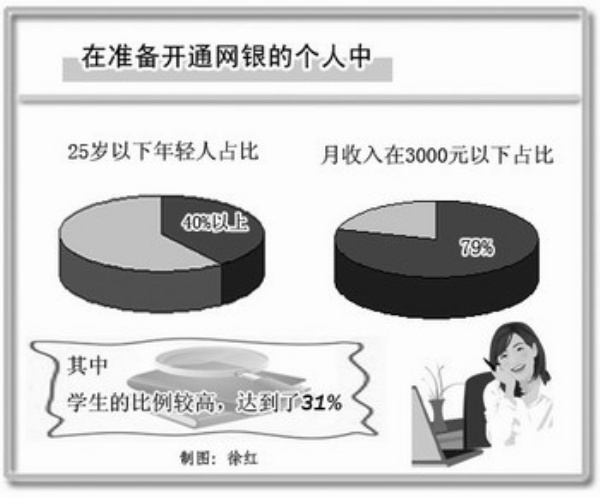 2009年,全国城镇人口中,个人网银用户的比例为20.9%,2008年个人网银用户的比例为18.9%。其中活动用户占76.7%,呆滞用户占23.3%;未来一年的潜在用户比例为13.9%。全国企业网银用户的比例为40.5%,比2008年略有下降,企业网银交易用户比例为70.3%,2008年这一比例为64.4%。