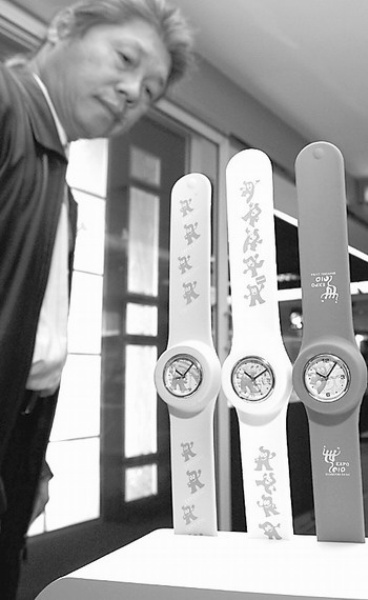 下图:1月19日,“中国2010年上海世博会特许产品(礼品)展示订货会”在上海世贸商城开幕,一款运用新材料技术的无搭扣式世博运动手表引人注目。