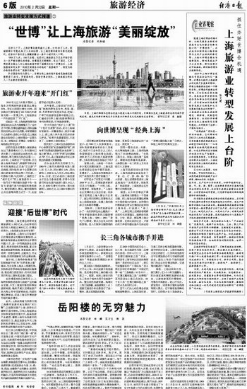 以《岳阳楼记》千古绝唱为背景,立足于充分挖掘、用好以岳阳楼为代表的丰富旅游资源,变资源优势为经济优势,岳阳市委、市政府敲响了岳阳旅游又好又快发展的劲鼓。岳阳旅游跨越发展的大幕徐徐展开。站在岳阳楼主楼上,敖然手指烟波浩渺的洞庭湖介绍说,其实在2004年之前,只有在这里才能看到八百里洞庭的气势,在别的地方视线都被遮挡了,经过大规模的整修后,从汴河街到岳阳楼主楼之间1.2公里的沿江长廊都成了人们远眺洞庭湖的最佳场所。2007年初,岳阳市贯彻落实科学发展观,加大力度保护生态坏境,环洞庭湖的234家造纸污染企业被关停,洞庭湖的水更清了,游客能看到洞庭湖里鱼翔浅底、碧波荡漾的壮阔画面。