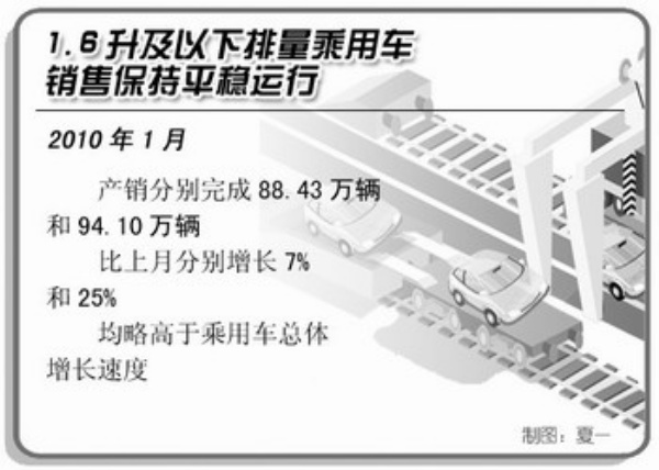谈到乘用车市场对于整体汽车市场的推动,就不得不说1.6升及以下排量的车型。今年1月开始,国家对1.6升及以下排量乘用车购置税优惠由上年的5%调整为2.5%,从1月该排量车型的销售情况看,基本保持平稳运行,当月产销分别完成88.43万辆和94.10万辆,比上月分别增长7%和25%,均略高于乘用车总体增长速度。而交叉型乘用车作为购置税优惠和汽车下乡政策的受惠车型,1月产销增速较快,月产销分别为24.57万辆和25.22万辆,比上月分别增长24%和49%。
