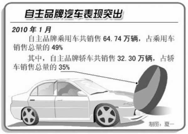 在乘用车市场,自主品牌汽车表现抢眼,市场占有率继续提升。1月自主品牌乘用车共销售64.74万辆,占乘用车销售总量的49%,2009年这个数据为44%。自主品牌轿车的市场占有率也从2009年的30%上升为35%,共销售32.30万辆。在轿车销量的前十位中不乏自主品牌的身影,比亚迪F3更是以3.56万辆的单月销量居首。在2009年比亚迪F3实现了从1万辆到2万辆再到3万辆的跨越,新的一年其热销势头不减。