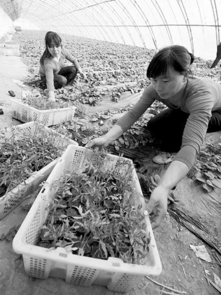 2月23日,河南省中牟县白沙镇的两名农民在温棚内套种西红柿苗。随着天气逐渐转暖,河南各地农民开始进行春耕备播和田间管理,为农业丰收打下基础。 新华社记者 朱 祥摄
