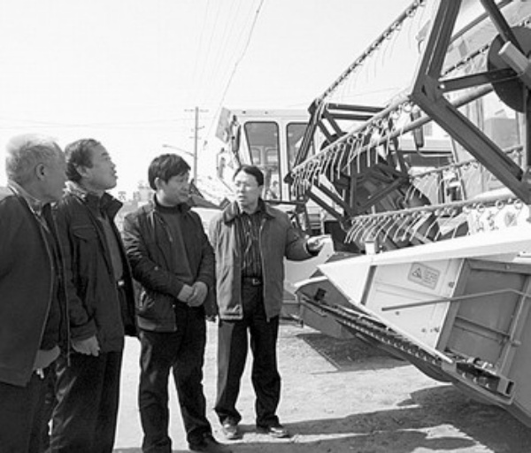 2月20日,陕西户县大王镇卓北村村民在咸阳农机大市场选购新型小麦联合收割机。 本报记者 夏先清摄