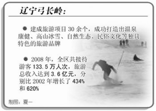 “除热泉外,我们还有冷泉。泉水清澈透明,含有锶、硒等18种微量元素,日开采量可达9020立方米。”弓长岭区经贸局局长杨俊彪兴致勃勃地介绍,该区境内冷热两泉相距不过300米,一个夏日冰凌如玉,一个冬天热气缭绕,双泉并涌而出,景色很是壮观。“冷热双泉的独特资源,决定了弓长岭区在培育接续产业过程中,优先选择发展旅游产业。”杨俊彪说。2003年起,弓长岭区开始了“以发展旅游业为龙头,以延伸产业链为重点”的转型探索之路。