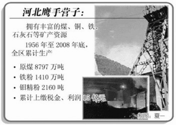 随着矿产资源的日渐枯竭,鹰手营子经济发展遇到困难。2009年3月5日,河北省承德市鹰手营子矿区被列入国务院确定的第二批32个资源枯竭型城市名单。鹰手营子矿区积极借助国家政策,探索转型之路。