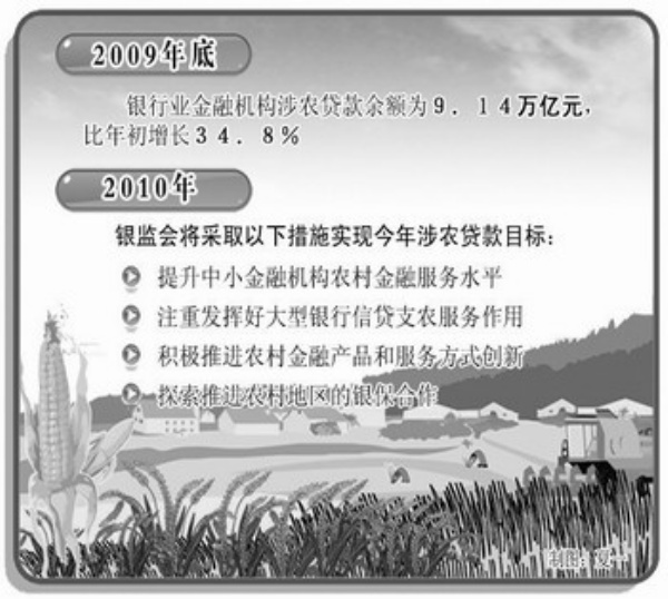 臧景范表示,为确保2010年涉农贷款“三个高于”目标能够实现,银监会将采取一系列措施:一方面要求提升中小金融机构农村金融服务水平,督促引领农村中小金融机构特别是农村合作金融机构继续加大涉农贷款和小额贷款比重,加大解决空白乡镇金融服务工作力度;另一方面注重发挥好大型银行的信贷支农服务作用,督促农村信用社(含农村商业银行、农村合作银行)牢固树立支农服务宗旨,巩固和提升支农主力军地位。指导农业银行完善“三农”金融事业部运作机制,构建专业化的支农服务体系。推动邮政储蓄银行加快网点改造,提升县(市)网点功能,积极探索发展小额贷款业务。
