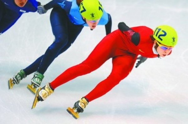 当地时间2月26日,在温哥华冬奥会短道速滑女子1000米决赛中,中国选手王 以1分29秒213的成绩获得冠军。这是王 (右)在比赛中。