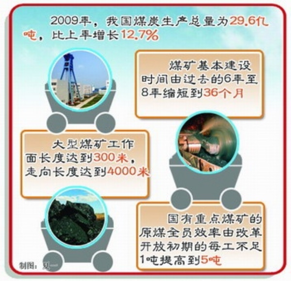 2009年,我国煤炭生产总量为29.6亿吨,比上年增长12.7%;煤炭消费总量达到30.2亿吨,比上年增长9.2%,在由煤炭、石油、天然气和水电等一次能源构成的能源消费总量中,所占比重达到68.7%。