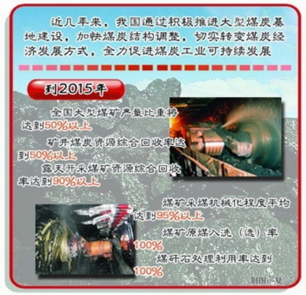 根据有关规划,到2015年底,全国大型煤矿产量比重将达到50%以上;矿井煤炭资源综合回收率达到50%以上,露天开采煤矿资源综合回收率达到90%以上;煤矿采煤机械化程度平均达到95%以上,综掘机械化程度达到70%以上;煤矿原煤入洗(选)率100%,矿井水达标排放、利用率90%以上,煤矸石处理利用率达到100%。