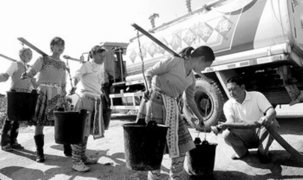 2月26日,云南省红河哈尼族彝族自治州开远市建设局将生活用水送到苗寨份玉村。 新华社记者 陈海宁摄