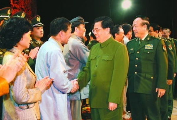 演出结束后,胡锦涛等走上舞台,与演职人员亲切握手,祝贺演出成功,并与大家合影留念。