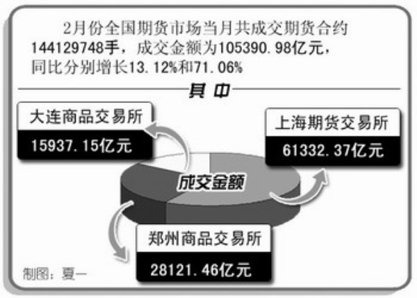 本报讯 记者刘溟报道:中国期货业协会最新统计表明,1—2月份全国期货市场累计成交期货合约380664880手,累计成交金额为276827.88 亿元,同比分别增长120.34%和166.52%。受春节长假影响,2月份全国期货市场成交规模较上月下降,当月共成交期货合约144129748手,成交金额为105390.98亿元,同比分别增长13.12%和71.06%,环比分别下降39.07%和38.52%。