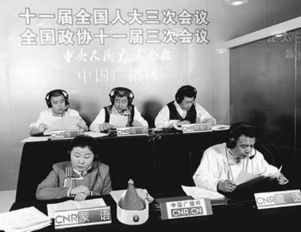 左图 3月3日下午,全国政协十一届三次会议在北京人民大会堂开幕。大会现场,中央人民广播电台用多种民族语言进行直播。 本报记者 赵 晶摄
