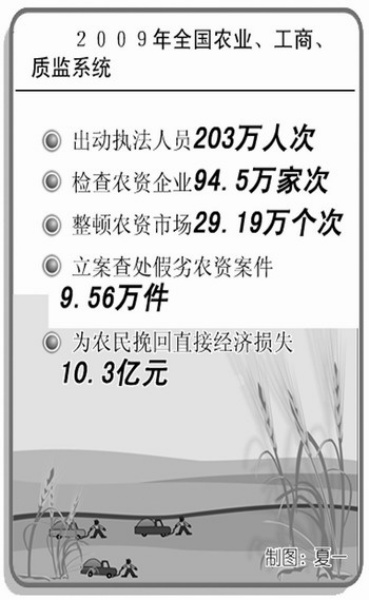 据统计,2009年全国农业、工商、质监系统共出动执法人员203万人次,检查农资企业94.5万家次,整顿农资市场29.19万个次,立案查处假劣农资案件9.56万件,捣毁制假售假窝点318个,取缔无照经营户8362户,为农民挽回直接经济损失10.3亿元。