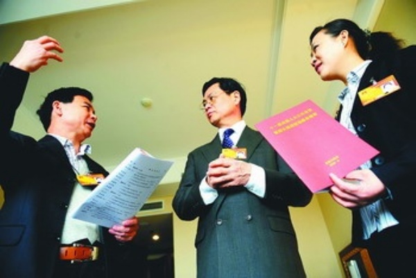 3月3日上午,广东代表团驻地。李兴浩代表(左一)、胡小燕代表(右一)均来自企业,他们与陈云贤代表(中、广东佛山市市长)正就经济发达地区的用工制度及现状交流看法,共议深化改革的措施。 本报记者 李景录摄