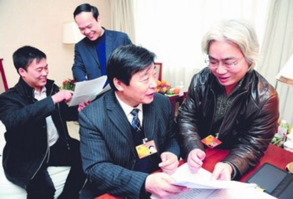 3月4日上午,人大山东代表团李建华代表(右二、山东华泰集团董事长)与同团代表周瑶琪(右一、中国石油大学华东油气资源与环境地质研究所所长),在驻地就黄河三角洲高效生态经济区建设配套政策的建议及议案共同商讨。