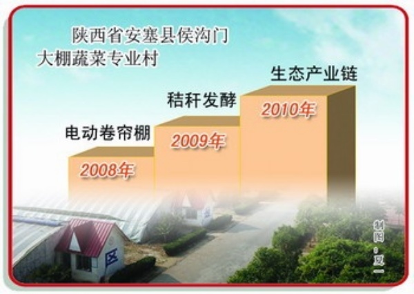 2009年,全村近一半的大棚内用上了秸秆发酵技术。发酵产生的二氧化碳不仅有利于蔬菜增产增收,而且还使原来只能烧掉的秸秆变废为宝。