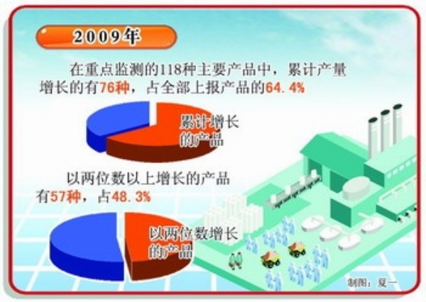 主要产品产量保持较快增长。在重点监测的118种主要产品产量中,2009年累计产量增长的产品有76种,占全部上报产品的64.4%,其中以两位数以上增长的产品有57种,占48.3%。固定资产投资拉动工程机械产量加速增长,挖掘机、压实机和混凝土机械产量同比分别增长14.1%、21.8%和42.4%;新能源发电设备增势较强,全年风电设备增长1.7倍,其中12月份增长48.4%。通用设备主要产品中,发动机增长30.1%,其中汽车用发动机增长44.6%;金属切削机床、金属成型机床产量分别为58.1万台和21.9万台,首次成为世界机床第一大生产国。
