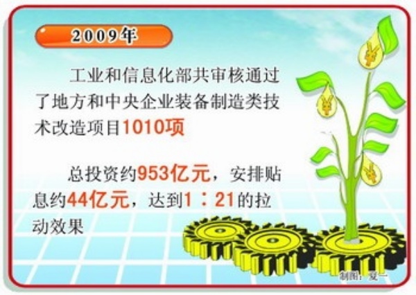 加大技术改造投入,增强企业自主创新能力是《装备制造业调整和振兴规划》的重要内容之一。据统计,2009年工业和信息化部共审核通过了地方和中央企业装备制造类技术改造项目1010项。这些项目涵盖了高档数控机床、基础零部件、能源装备、铁路及轨道交通装备、农用机械等重要领域。
