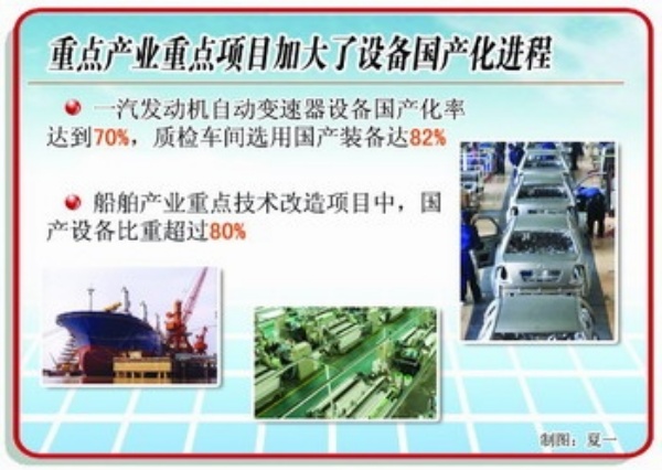 通过支撑产业振兴重点项目,装备国产化也取得新突破。据了解,各项重点产业重点项目都加大了设备的国产化进程。如汽车产业重点项目中的一汽发动机自动变速器设备国产化率达到70%,质检车间选用国产装备达82%;船舶产业重点技术改造项目中大量采用国产设备,比重超过80%;钢铁、石化等产业重点项目也加大了国产设备的选用。国防军工行业显著提高了军工建设项目中设备的国产化率,国产设备的比例已普遍提高到75%以上。