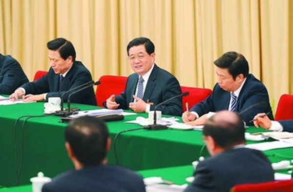 3月5日,中共中央总书记、国家主席、中央军委主席胡锦涛参加十一届全国人大三次会议江苏代表团的审议。 新华社记者 李学仁摄