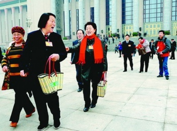 全国人大代表、山西省平顺县西沟村党总支副书记申纪兰(左二)走出会场时,手中提着印有“环境保护,从我做起”字样的毛竹编的篮子。她说:“保护环境重要的是从每个人做起。” 本报记者 李景录摄