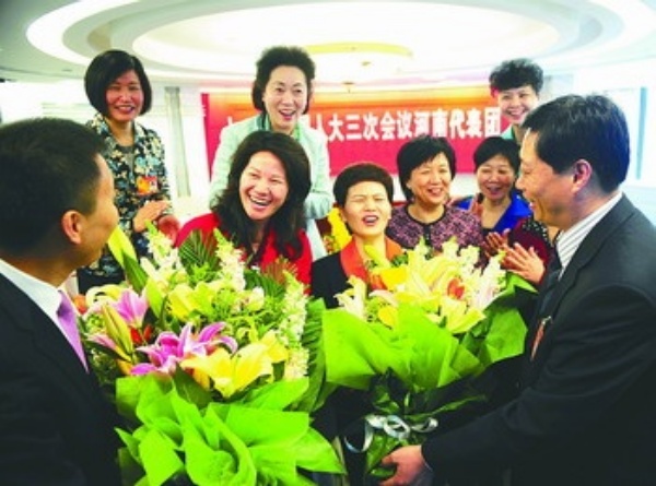 3月7日上午,人大河南代表团审议大会的有关报告结束后,该团的男代表特意为女代表们送上鲜花,祝她们“三八”国际劳动妇女节快乐。 本报记者 李景录摄