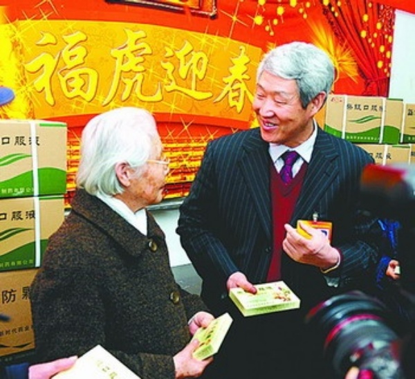 两会期间,山东鲁南制药集团股份有限公司董事长赵志全代表(右)来到北京市朝阳区安园社区调研,并将治疗流感的常用药送给社区老年人。 本报记者 李景录摄
