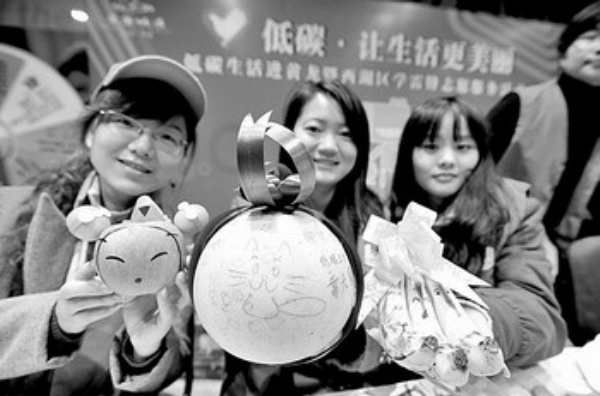 志愿者展示其设计的“水果心情”环保礼品。浙江杭州举行的“低碳,让生活更美丽”活动上,志愿者们通过介绍垃圾分类、赠送环保礼品等方式,倡导低碳生活。 李 忠摄(新华社发)