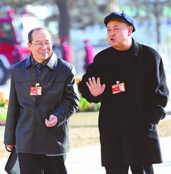 3月10日上午,全国政协十一届三次会议在人民大会堂举行第四次全体会议。金一南委员(左)和刘世民委员步入会场时,一直在交谈。 本报记者 赵 晶摄