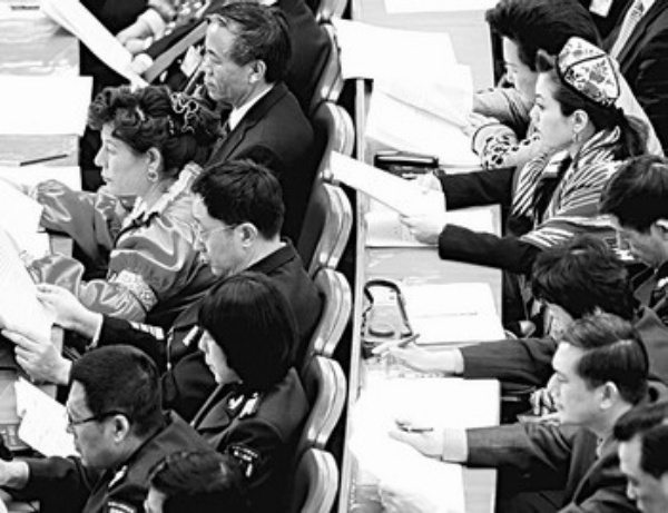 3月9日,十一届全国人大三次会议在人民大会堂举行第三次全体会议。图为代表们听取全国人大常委会工作报告。 本报记者 李景录摄
