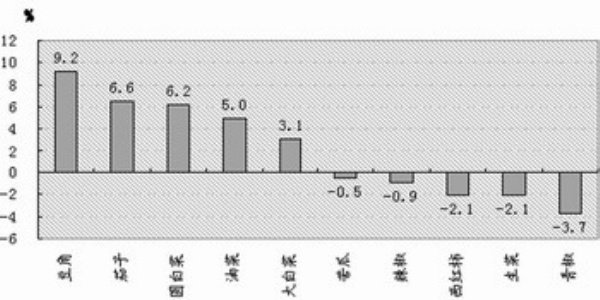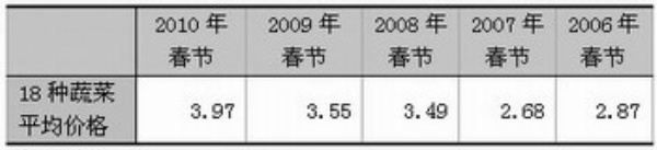 蔬菜价格小幅上扬。据商务部市场运行调节司对全国36个大中城市监测,春节期间(2月15日至21日)18种蔬菜批发价格平均较节前上涨1.8%,较去年同期上涨27.7%。与节前相比,价格上涨的有12种,持平的有1种,下跌的有5种。涨幅较大的为豆角、茄子、圆白菜,分别为9.2%、6.6%和6.2%;降幅较大的有青椒、生菜和西红柿,分别为3.7%、2.1%和2.1%。
