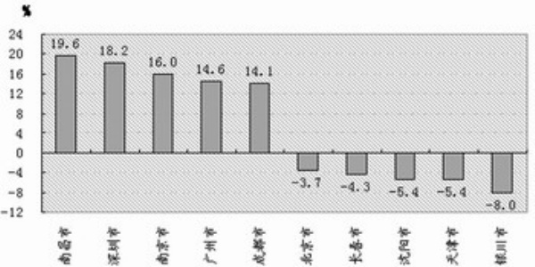 菜价地域特征明显,呈“南涨北跌”。据监测,春节期间,蔬菜价格环比上涨的城市有18个,下降的有13个。其中,南昌、深圳、南京、广州、成都涨幅较大,分别为19.6%、18.2%、16%、14.6%和14.1%;银川、天津、沈阳、长春、北京降幅较大,分别为8%、5.4%、5.4%、4.3%和3.7%。