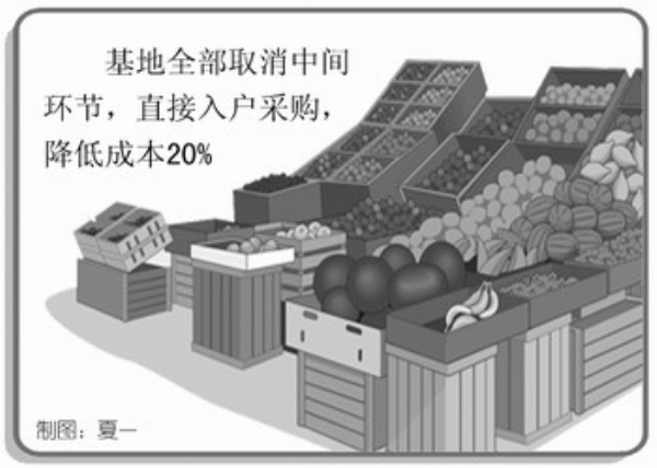 吴坚忠给记者简单算了一下农超对接是如何减少流程降低成本的。以山东的反季大棚蔬菜为例,如果山东蔬果通过传统渠道进入北京超市或农贸市场,一般需要经过“农户————地头经纪人————山东区域批发经纪商(或区域集货市场销售)————北京批发经纪商(或批发市场销售)————农贸市场商户(或超市供应商)————超市卖场————消费者”这样一条或多条长长的供应链,这不仅导致蔬果成本层层增加,商品损耗不断增加,而且在经历了多次装车、配货、卸车、改包装等过程后,从采到市场时间可能远超过48小时,商品鲜度和品质还可能出现明显下降。