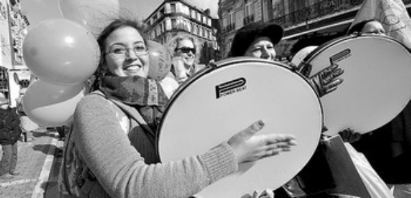 在比利时首都布鲁塞尔,妇女代表参加庆祝三八国际劳动妇女节游行。2万多名来自比利时各地的各界人士在首都布鲁塞尔市中心举行游行,纪念三八国际妇女节100周年。新华社记者武巍摄