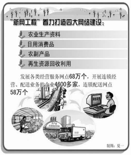 全国供销合作总社近几年在全系统推进“新农村现代流通经营服务网络工程”(简称“新网工程”),围绕构建城乡“双向流通”的现代流通网络,着力打造农业生产资料、日用消费品、农副产品和再生资源回收利用4大网络建设。连续3年的中央一号文件都要求大力推进“新网工程”,中央财政近3年累计给予资金扶持超过18亿元。