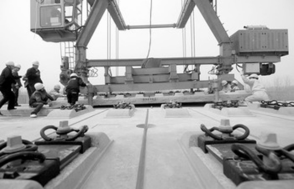 3月17日,中铁十二局京沪高铁四标段开始进行轨道板铺设准备作业。京沪高速铁路建设目前稳步推进。京沪高速铁路全长1318公里,于2008年4月18日开工建设。 新华社记者 刘军喜摄