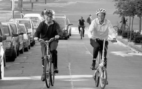 3月15日,阿根廷首都布宜诺斯艾利斯市市长毛里西奥·马克里(左)骑着自行车前往市政府上班。 布宜诺斯艾利斯市政府日前推出了25公里长的自行车专用道,鼓励市民用自行车代步,缓解交通堵塞问题。 新华社发