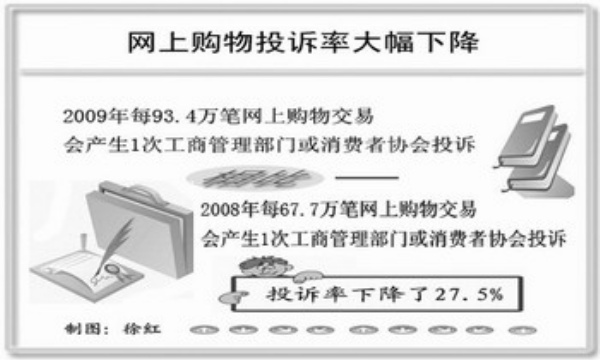市场咨询机构正望咨询的调查数据显示,2009年每93.4万笔网上购物交易产生1次工商管理部门或消费者协会投诉,与2008年每67.7万笔网上购物交易就会产生1次工商或消协投诉相比,投诉率下降了27.5%。