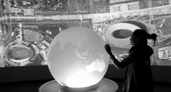 齐阳走过来对记者透露了其中奥秘。原来,这是我国首个人机互动触摸球,只要轻轻在球面任意区域点触,背景的一块7米宽的投影屏幕立即会作出反应。从上到下抚摸它,屏幕画面就会变化。轻拍一下它,画面则跳转到另一影像系统,如由各大卫星环绕的太阳系系统、外太空系统、五大洲系统等。而如果快速地从下往上划蹭球面,一道激光柱就会射向“外太空”。