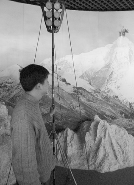 馆里摆放的一些传统测绘仪器比起数字化智能机器来,虽然工艺非常复杂,机器比较笨重,但应该说都是功勋仪器,为测绘事业做出了贡献。如展厅里有一台庞大的机器,上面有一个2米多高的大型拱架。这台被叫做“拱鼻子”的机器是用来调整航片的。记者试着将脑门靠在这个大家伙的相应位置,并透过目镜作观看航片状,鼻子自然顶在机器上,真的就像在“拱”鼻子。