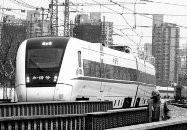 3月18日,一辆动车组列车从沪宁城际铁路上海西站铺轨工地旁驶过。 目前,沪宁城际铁路已全线铺通,将于世博会期间正式建成通车。沪宁城际铁路起自上海,经昆山、苏州、无锡、常州、丹阳、镇江至南京,正线全长约300公里。 新华社发