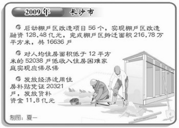近年来,长沙市委、市政府始终将改善民生作为城市发展建设的重中之重,把安居工程列为首要工程,出台了一系列改革住房保障方式的举措,2008年住房保障改实物分配为货币直补;2009年是长沙市安居工程建设的攻坚之年和“棚改”的开局之年,长沙住房保障政策效应全面释放。据统计,2009年长沙启动棚户区改造项目56个,实现棚改融资128.48亿元,完成城市房屋总拆迁面积216.78万平方米,共16636户,棚户区改造拆迁户有93%重新购买了新房或二手房,拆迁户共购房120多万平方米;全市对人均住房面积低于12平方米的52038户低收入住房困难家庭实现应保尽保,其中以经济适用住房方式保障25179户,廉租住房方式保障26859户;发放经济适用住房补贴凭证20321户,发放货补资金11.8亿元。